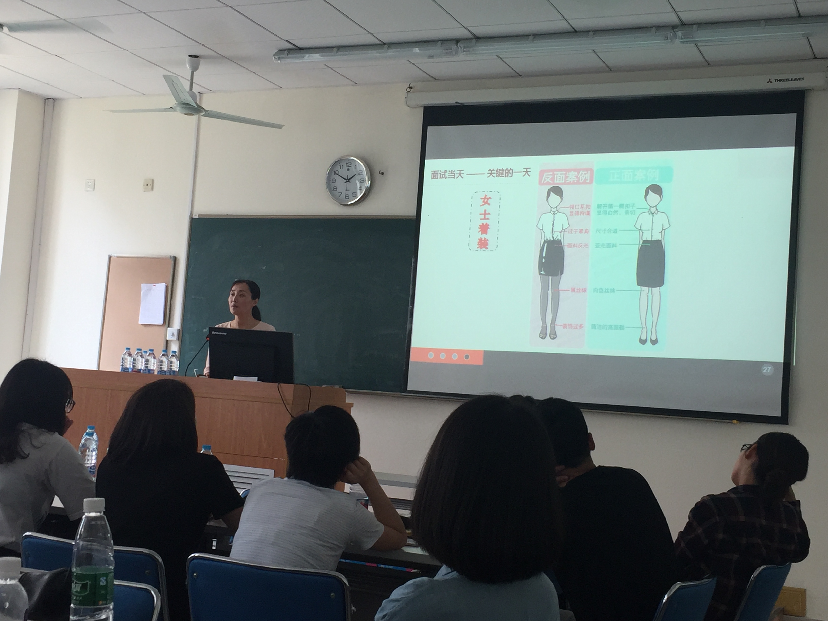 冀老师深入浅出的给同学讲解了关于大学生的社交礼仪、面试礼仪、办公室礼仪和化妆技巧四个方面,这些都是和实习、求职过程息息相关的内容。日常生活中的社交礼仪大家在一定程度上都有些知晓,但是很多小细节并不一定会注意到。比如,我们都知道握手需要用右手,但是不一定会注意要由谁先伸手,或是在男女士握手的时候,男士只能握住女士的手指等细节。