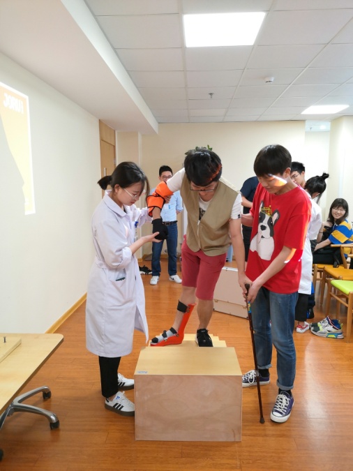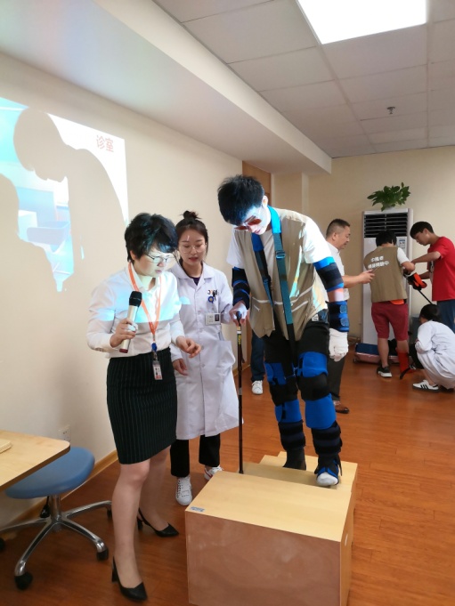 为了让大家真切地感受到老人生活的不易,几位同学穿戴专业装备进行了中风场景体验(穿中风模拟服体验步行及走台阶)和高龄场景体验(穿高龄体验服体验商店购物及医院看病场景)。模拟体验者体验到了高龄老人身体机能退化后生活的艰难状态,以及中风老人生活不便的痛苦,这些切身感受加深了大家对失能老人的感同身受与理解。