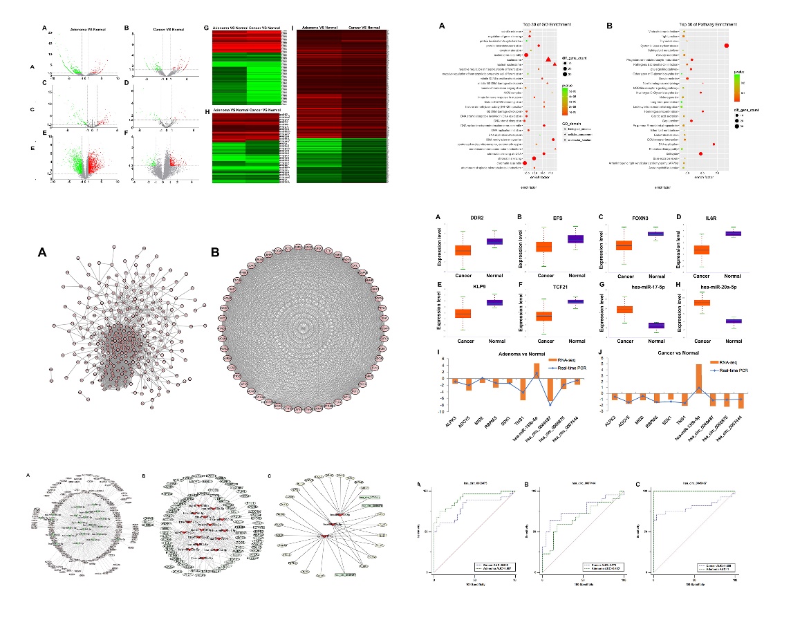 结直肠癌是常见的恶性肿瘤,发病率逐年上升,防控形势严峻。结直肠癌可以由腺瘤转化而来,但并不是所有的腺瘤都会转化成癌,并且结直肠癌从腺瘤发展到恶性肿瘤有一个较长的过程,因此,如何寻找有效的方法进行早期诊断,预测腺瘤患者究竟会不会转变成恶性肿瘤并进行早期治疗,成了学术界所关注的焦点。我们一直致力于炎癌转化机制和早期生物标志物的发现,本研究检测了正常结肠黏膜、腺瘤、结直肠癌三种组织中的mRNA(信使RNA),miRNA(小RNA)和circRNA(环状RNA)表达谱,通过大量生物信息学分析以及TCGA数据库大样本验证,获得了在腺瘤向癌转化过程中可能起关键作用的RNA,并构建了相关的ceRNA(内源竞争RNA)网络,进一步阐明了腺瘤向癌转化的机制。另外,通过ROC分析获得了3个潜在的circRNA(hsa_circ_0049487,hsa_circ_0066875和hsa_circ_0007444)可用于预测腺瘤向癌转化。