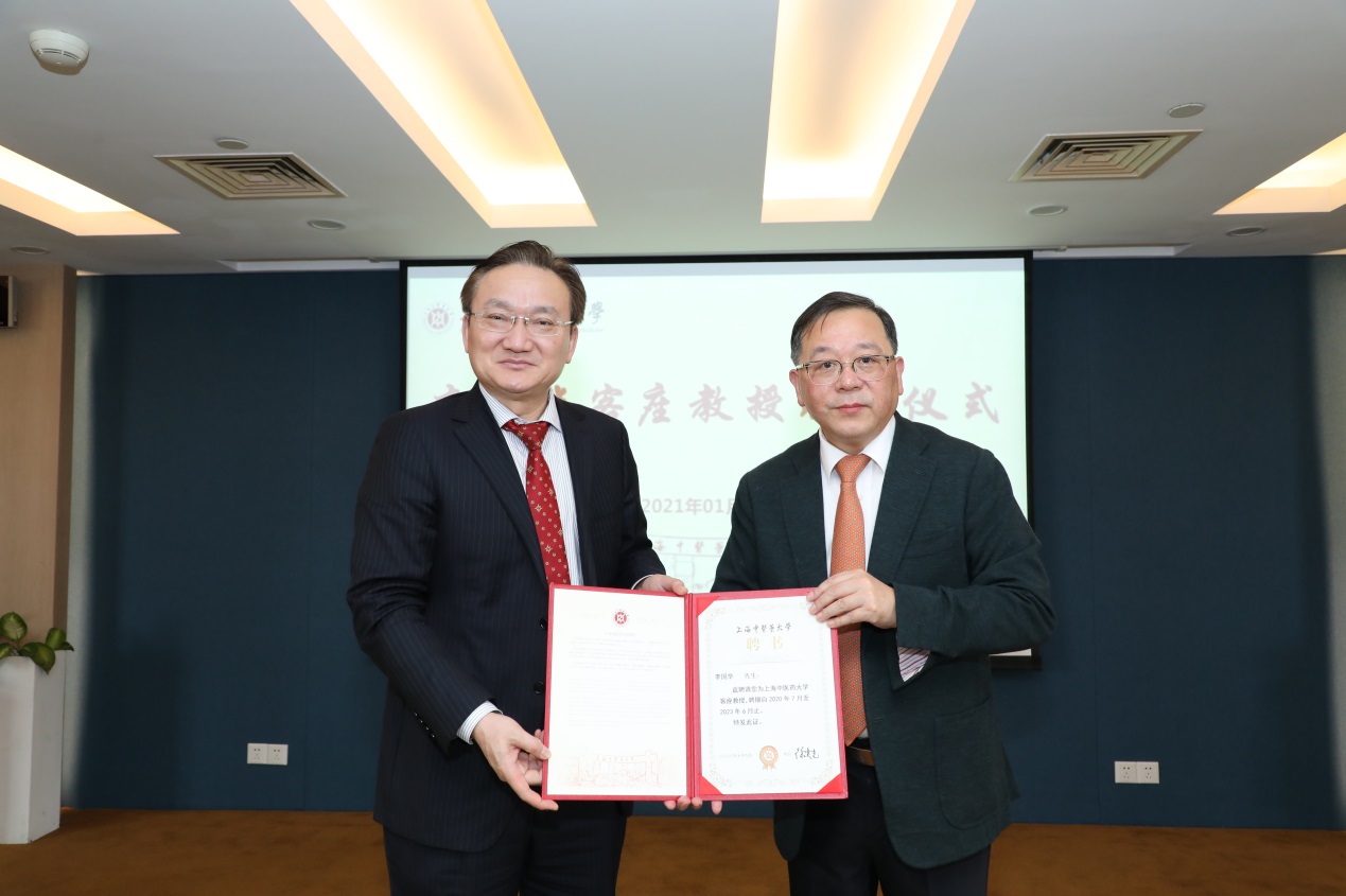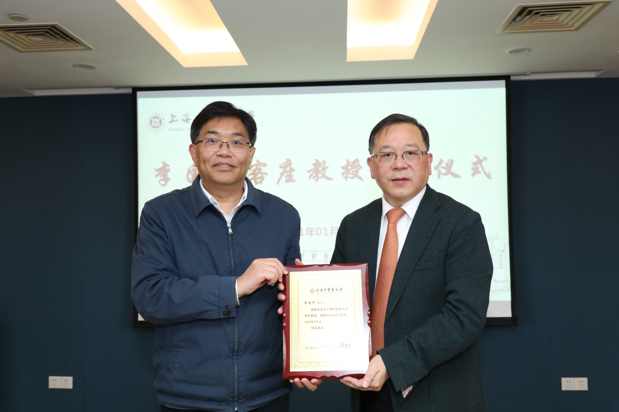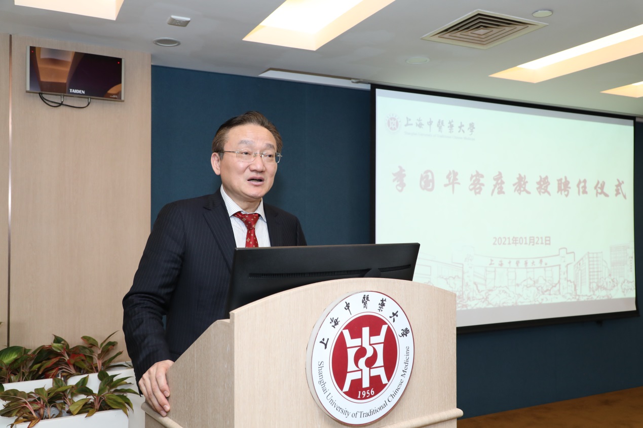 在接下来的客座教授聘任环节,徐建光校长、曹锡康书记分别向李国华教授颁发了客座教授聘任证书及聘任铜牌、校徽并合影。李国华教授对学校此次聘任其作为学校客座教授表示荣幸与感谢,对金沙集团wwW3354CC“不重其全重其优、不重其大重其特、不重其名重其实”的办学理念高度认可。他表示,作为学校的一员,今后将与金沙集团wwW3354CC的领导、同仁一起,为把中医药事业继续发扬光大添砖加瓦。