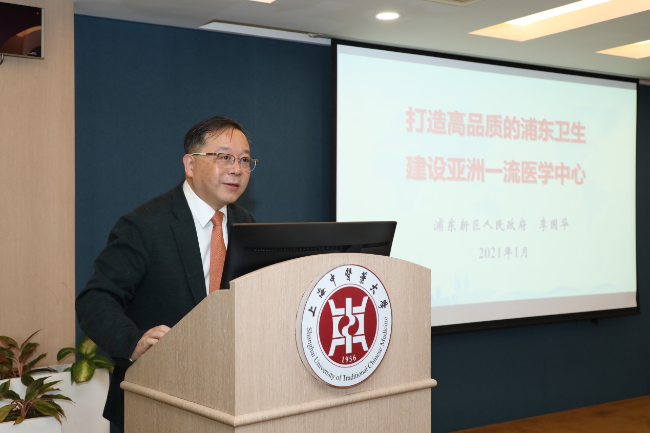 陈红专副校长向李国华教授的到来表示感谢与欢迎,向与会师生介绍李国华教授的研究方向及主要成就。李国华教授现任上海市浦东新区人民政府副区长,分管区教育、卫生健康、文化、体育、旅游、广播电视、文史、红十字会等工作。他从事普外医疗科研工作27年,在血管外科、肿瘤外科等介入治疗,血液净化治疗等方面尤为擅长。