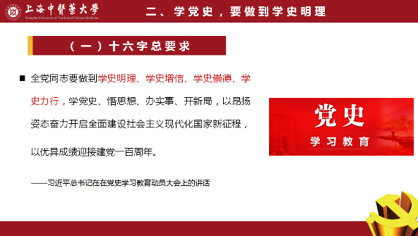 段艳霞老师从“党史学习教育的重大意义”“学党史,要做到学史明理”“学史明理,做新时代接班人”三方面层层展开。段书记明确点出学习党史是牢记初心使命、推进中华民族伟大复兴历史伟业的必然要求;是坚定信仰信念、在新时代坚持和发展中国特色社会主义的必然要求;是推进党的自我革命、永葆党的生机活力的必然要求。通过习近平总书记讲话中“历史是最好的教科书”“党史是必修课”“历史是最好的老师”“中国革命历史是最好的营养剂”“全党团结成一块坚硬的钢铁”“节俭朴素,力戒奢靡是我门党的传家宝”六个妙喻,深刻阐释了党史学习的重大意义。