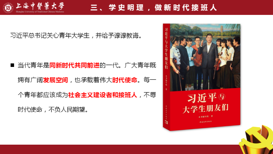 段书记以“学史明理,做新时代接班人”为切入点将党课推向高潮。“当代青年是同新时代共同前进的一代。广大青年既拥有广阔发展空间,也承载着伟大时代使命。每一个青年都应该成为社会主义建设者和接班人,