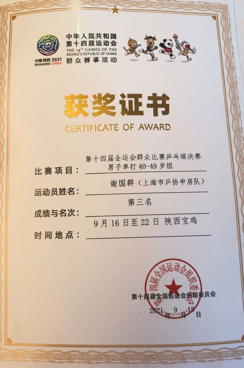 谢国群副院长与乒乓运动很早就结下了不解之缘。他曾是全国大学生乒乓球比赛的第一位台生冠军。对于参加这次全运会比赛及取得的成绩,谢国群表示,作为一名乒乓球爱好者能够代表上海参加全运会,既是一种光荣,更是一种责任。全运会不仅是为上海争光的赛场,也是实现人生价值的舞台。今后将继续发扬体育精神,和全院师生一起为更高更强的中医药特色公共卫生与预防医学学科建设奋力拼搏。