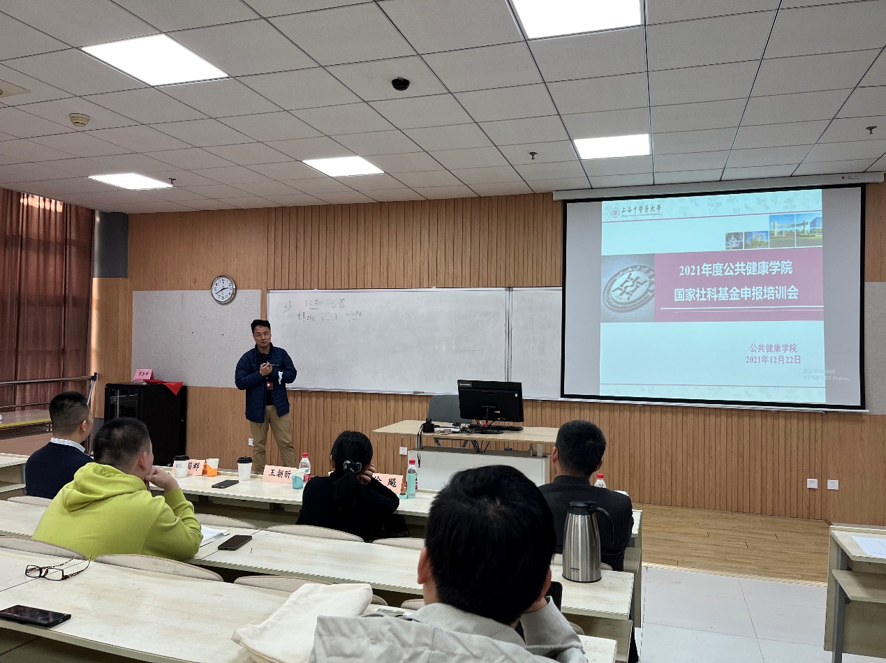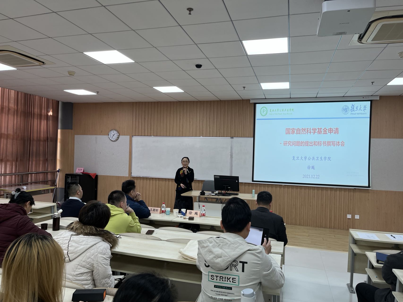 2021年12月22日下午,金沙集团wwW3354CC于10105教室举办国家自然科学基金申报培训会,会议邀请复旦大学公共卫生学院徐飚教授和上海交通大学医学院公共卫生学院王朝昕教授来校讲座。学院院长赵海磊、副院长谢国群和学校部分师生参与听讲,并与两位教授进行了交流。谢国群副院长主持培训会。