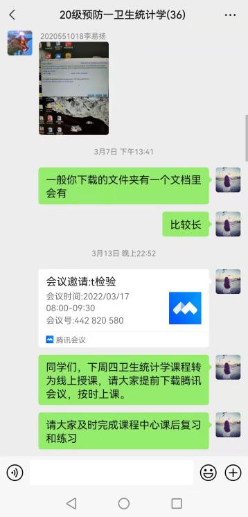 为了确保每位同学可以及时与老师进行学业讨论,教研室老师们以课程为单位建立微信群,确保每位学生进群。老师在群里公布课程相关信息,提前提醒学生做好上课准备,进行即时答疑。医学统计学是一门方法学科,有助于同学们开展科研,越来越受到同学们的重视,同学们在学习的过程中往往有诸多问题需要请教老师,教研室的老师们都以极大的热情积极回应和解答同学们的问题,课程教学活动经常延续到晚上和周末,老师们却毫无抱怨。她们一致认为同学们极高的学习热情和最大限度获得知识,是对老师教学工作最大的回报和认可。研究生班或夜大学教学班级里,有学生因为参与防疫一线工作而不能按时上课,老师们通过直播时设置云录制或本地录制方式保存课程教学视频,提供给参加抗疫工作的同学们,使他们能够随时回放,补课学习,让其没有错过学习的后顾之忧。