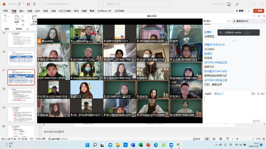 为应对新冠病毒的迅速传播,学校自2022年3月13日下午15时开始封闭管理,并通知第二天周一即开展全面线上教学。流行病与卫生统计学教研室长期承担学校本科、研究生、国教学院以及继续教育学院的大量教学任务,面对突然转变的在线教学,教研室的老师们没有慌乱,即刻在原有的线下教学和线上课程的基础上,组织和设计好两周的线上教学和答疑安排,并通知到各个教学班级同学。在富有教学经验的老师们积极应对下,紧张的大范围的教学形式改变没有打乱原本的教学秩序,老师们从容地在线上平台开展教学活动,同学们有序地在直播课堂上学习,在课程中心中获取教学资料,通过教学软件完成作业和课堂小考,师生积极互动,教学效果与线下教学差别无几。