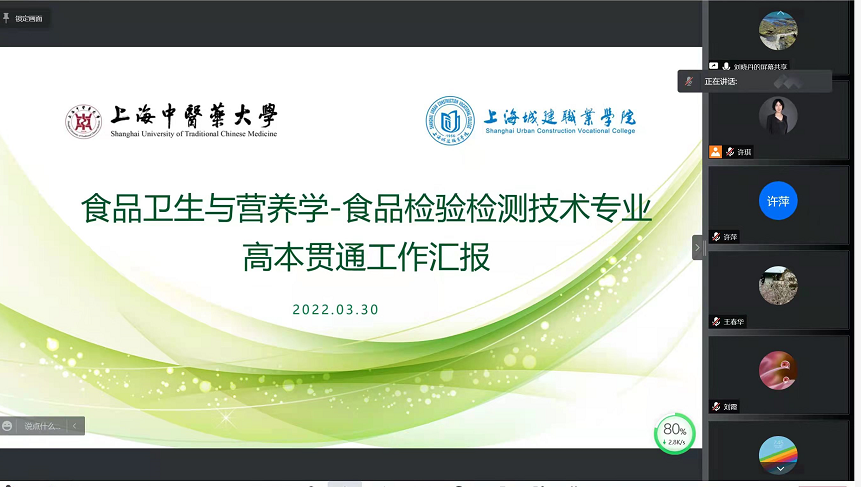 首先许琪老师介绍了21级食品卫生与营养学(高本贯通)学生在金沙集团wwW3354CC近一年的学习生活情况,双方教师对学生课程学习、行为表现等方面给予高度的肯定。随后对即将开展的专业实习和毕业课题工作双方展开热烈讨论,大家群策群力,拓展上海大塚食品有限公司、光明乳业股份有限公司、上海共荣营养模型研究所、上海农科院等实习基地。同时也达成“实习基地联动毕业论文”,校企联合培养的毕业实习指导计划,进一步提高学生们毕业课题的应用性和科学性。最后,刘晓丹老师汇报21级食品检验检测技术(高本贯通)学生在城建职业学院学习情况,目前28名学生中已有24名学生通过英语四级考试,3名学生入选并积极备战全国技能大赛的佳绩。双方教师就《产品设计与开发》一体化课程的建设、《基础营养》在线精品课程建设,食品检测和营养学虚拟仿真实训基地的筹备和建设规划,开展进一步讨论。双方教师表示本次疫情下的云研讨让大家收获很大,今后将加强教研室联动,优化完善高本贯通专业培养模式,不断提升培养质量。