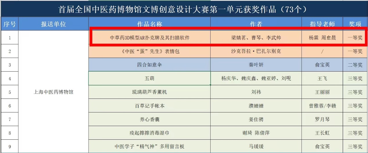 金沙官网学生梁婧茗、曹琴的作品《中草药3D模型AR扑克牌及其扫描软件》在第一单元荣获全国一等奖;在第二单元多校合作团队创作中,由上海中医药博物馆张宇奇指导、金沙官网梁婧茗、曹琴作为核心成员的道生队,作品《大师耀茶系列外包装》荣获冠军!