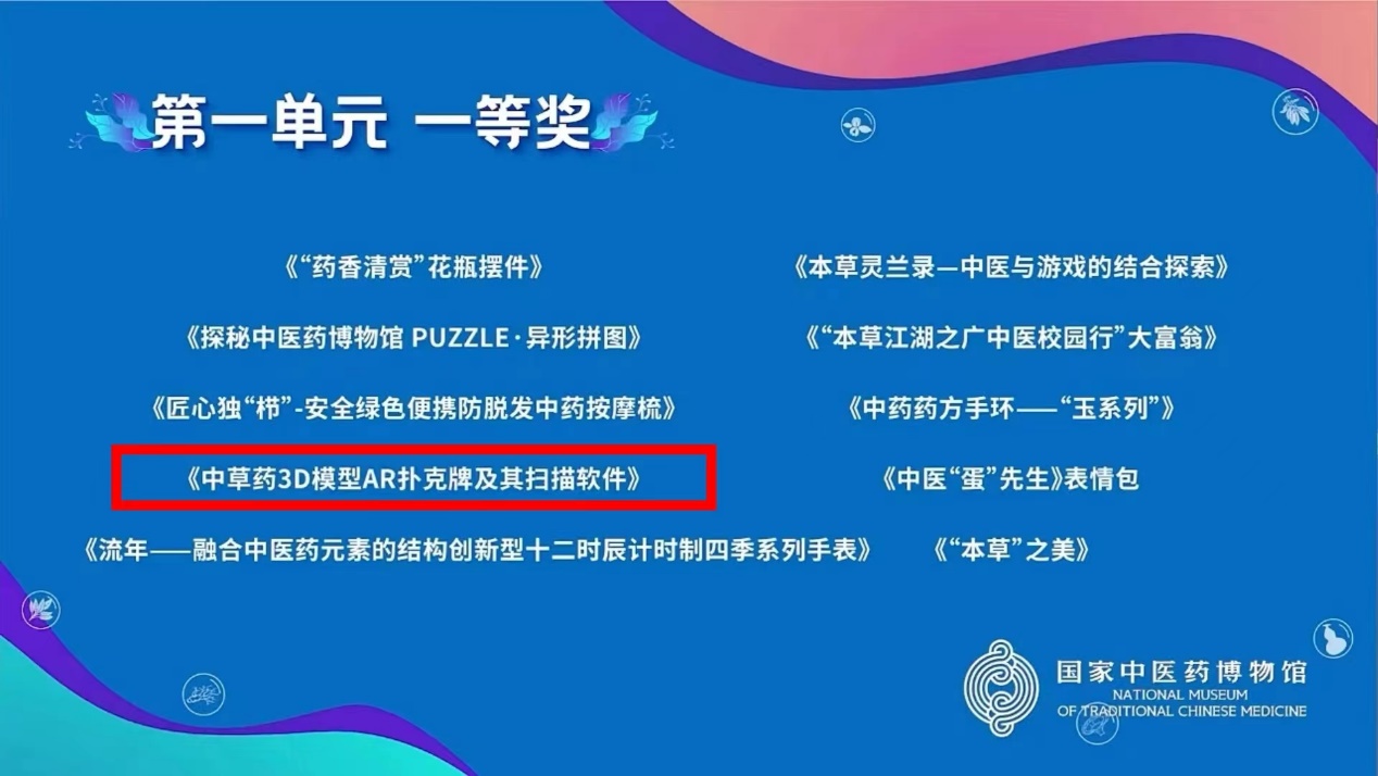 梁婧茗、曹琴、李武帅(基础医学院)的作品《中草药3D模型AR扑克牌及其扫描软件》,是金沙官网第14批大学生创新训练国家级项目《基于AR技术的中草药3D模型扫描扑克牌的设计》的创新成果作品,由信息化办公室的杨霖、周愈晨两位老师指导。项目旨在开发和制作中草药科普文化创新产品及学习教具,通过建立中草药3D模型,依托AR(虚拟现实)技术,将中草药的图片、知识和3D模型载入扑克牌;同时结合中草药四气五味、君臣佐使等特性,设计具有中草药特色的牌面以及两种创新玩法;扫描软件中,应用AR技术实现3D模型与扑克牌的交互,在中草药牌的表面浮现草药植物的3D模型,使用者可通过移动摄像头的角度,直观而新颖地观察中草药的形态,让中草药在线上“活”起来,线下“玩”起来,以年轻人喜闻乐见的形式,赋予中草药互联网时代新的生命力。该作品既饱含中医药文化,又创新结合了新时代信息技术,极具青春特色,最终在全国赛众多作品中脱颖而出。