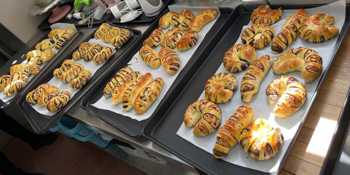 在干旦峰老师的带领下,同学们将食材混合、经过反复揉搓、摔打成光滑且柔软的面团,将其送往烘焙室发酵。