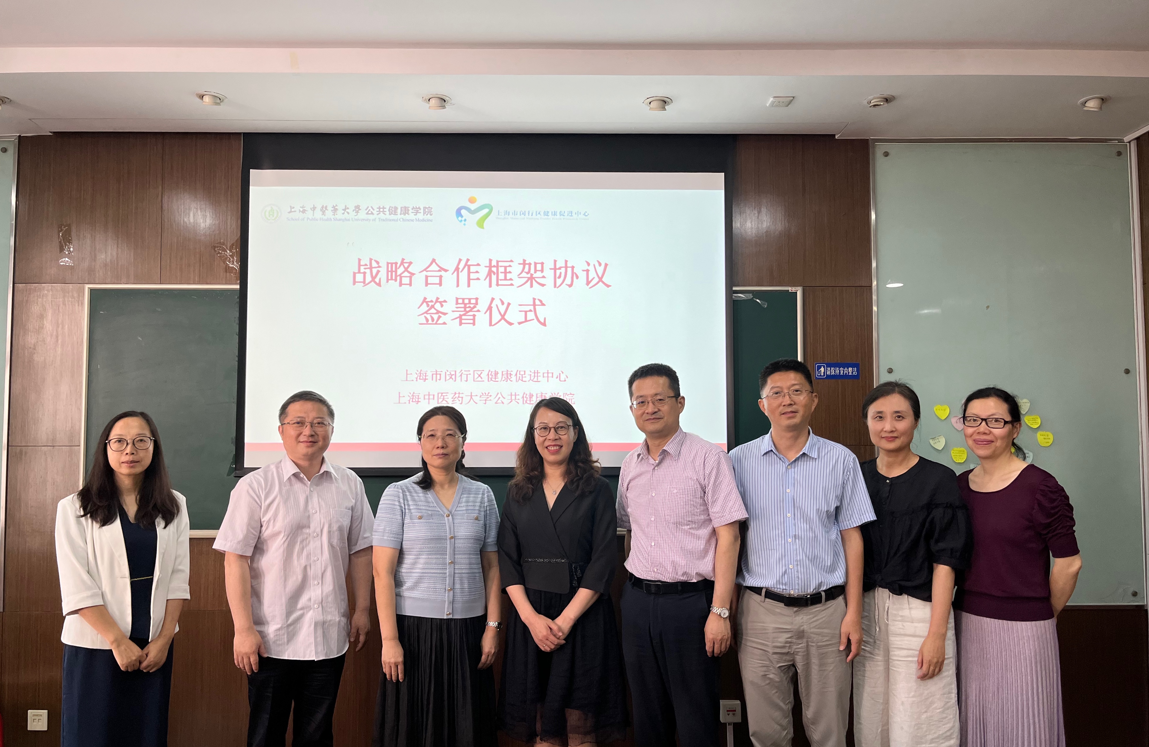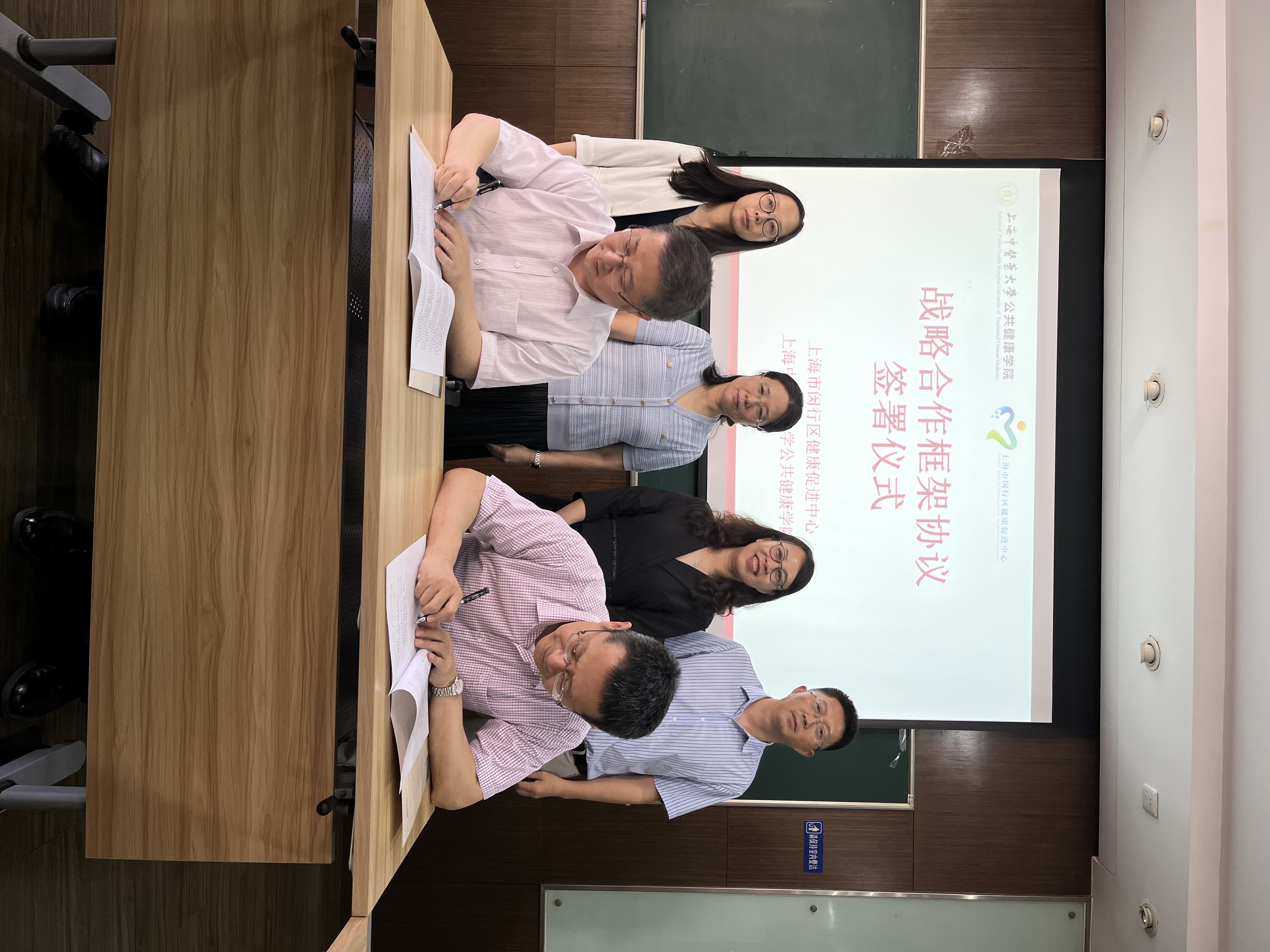 在双方人员共同见证下,赵海磊院长、简永志主任分别代表两家单位签署战略合作框架协议。本次签约是继2014年我校与闵行区开展全方位区校共建后在公共卫生领域的首次合作,开启双方在健康教育与健康促进学科建设、人才培养、科学研究等方面更加深入合作之门。