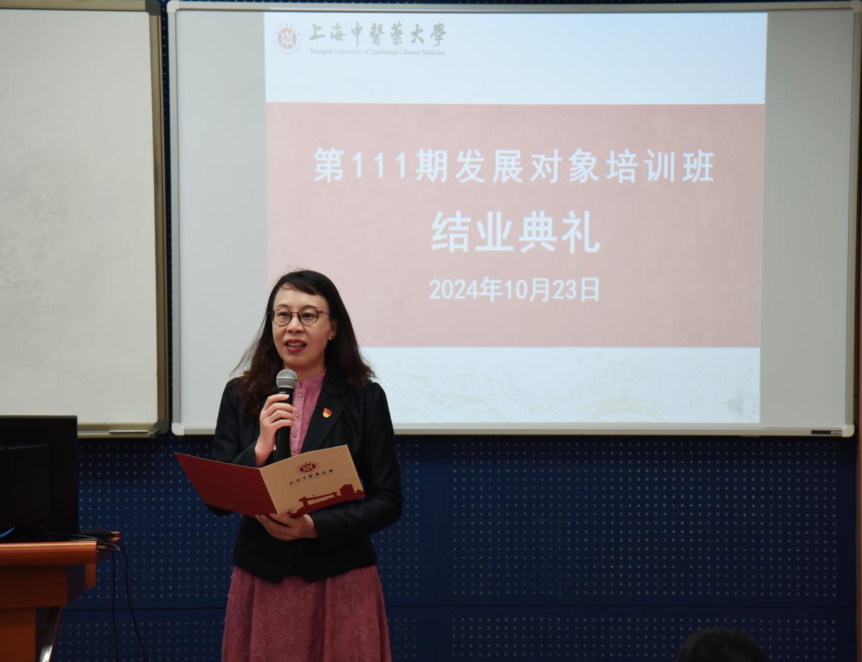 10月23日,由金沙集团wwW3354CC分党校承办的校第111期发展对象培训班结业仪式在6302教室顺利举行。校校党委组织部(统战部、党校)部长周宁慧、金沙集团wwW3354CC党委书记段艳霞、交叉科学研究院党委书记祝建龙、附属龙华医院党委副书记高炬、附属岳阳中西医结合医院党委副书记赵庆、针灸推拿学院党委副书记马杰以及培训班班主任、指导老师和全体学员参加结业仪式。金沙集团wwW3354CC党委副书记干旦峰主持。