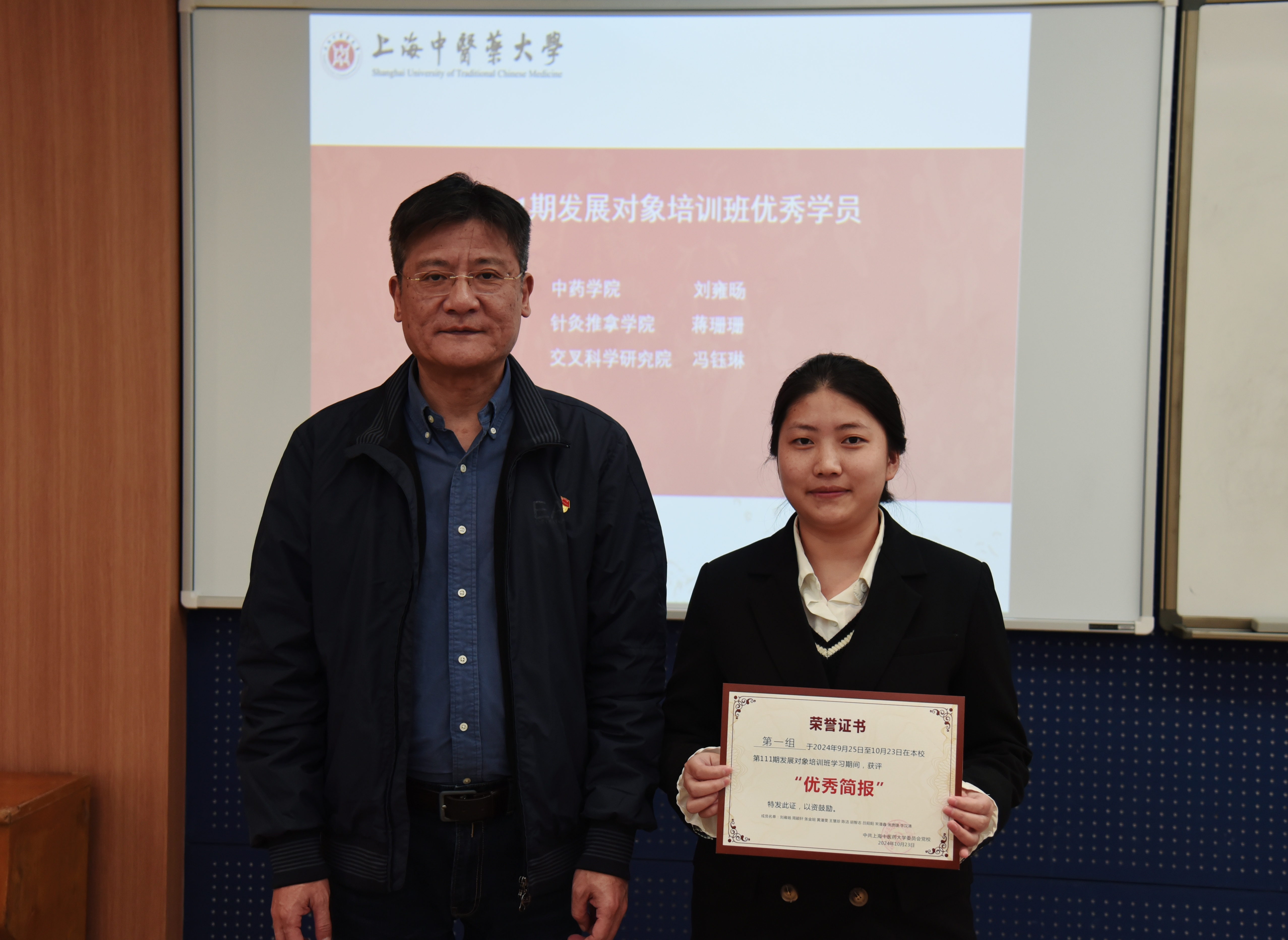 针灸推拿学院蒋珊珊同学作为优秀学员代表交流发言,从参加培训班的收获展开,表达了将以此为新起点继续深化学习,以更加饱满的热情、更加坚定的信念不断向党组织靠拢,为党和人民的事业和中医药传承与发展贡献智慧和力量。