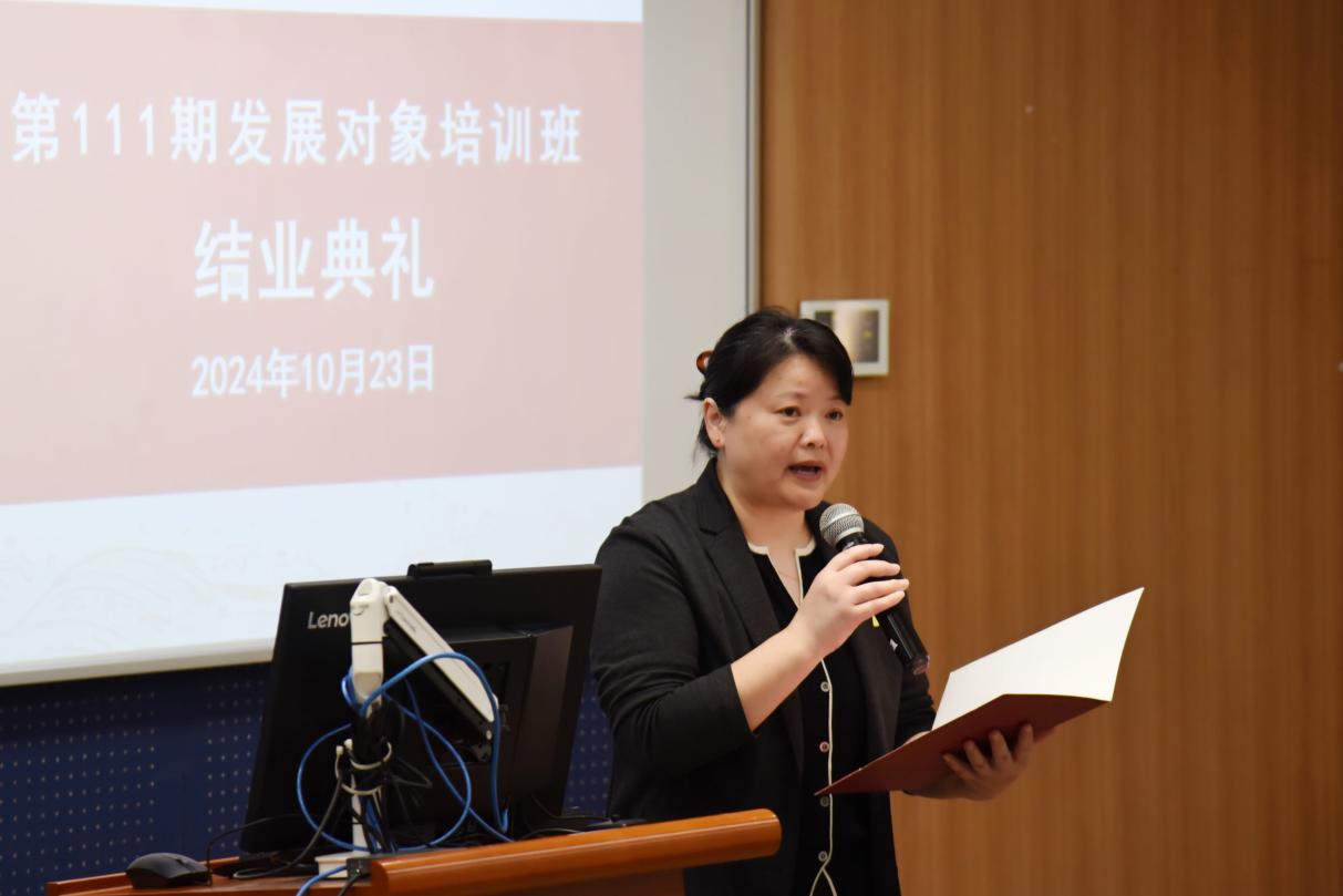 班主任江慧芬介绍了培训班开展情况。培训班通过专题党课、分组研讨、实践研学、简报制作等形式引导学员不断端正入党动机、坚定理想信念、增强党性修养,以党的理论知识测试、述学答辩、撰写学习小结等多形式进行考核,30名学员均顺利结业。