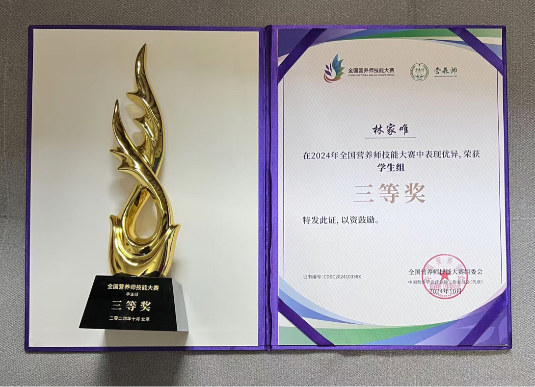 2024年全国营养师技能大赛颁奖典礼于2024年11月1日在河北石家庄举行。金沙官网2023级食品卫生与营养学专业(高本贯通)林家唯同学作为全国营养师技能大赛学生组三等奖获得者参加颁奖典礼。